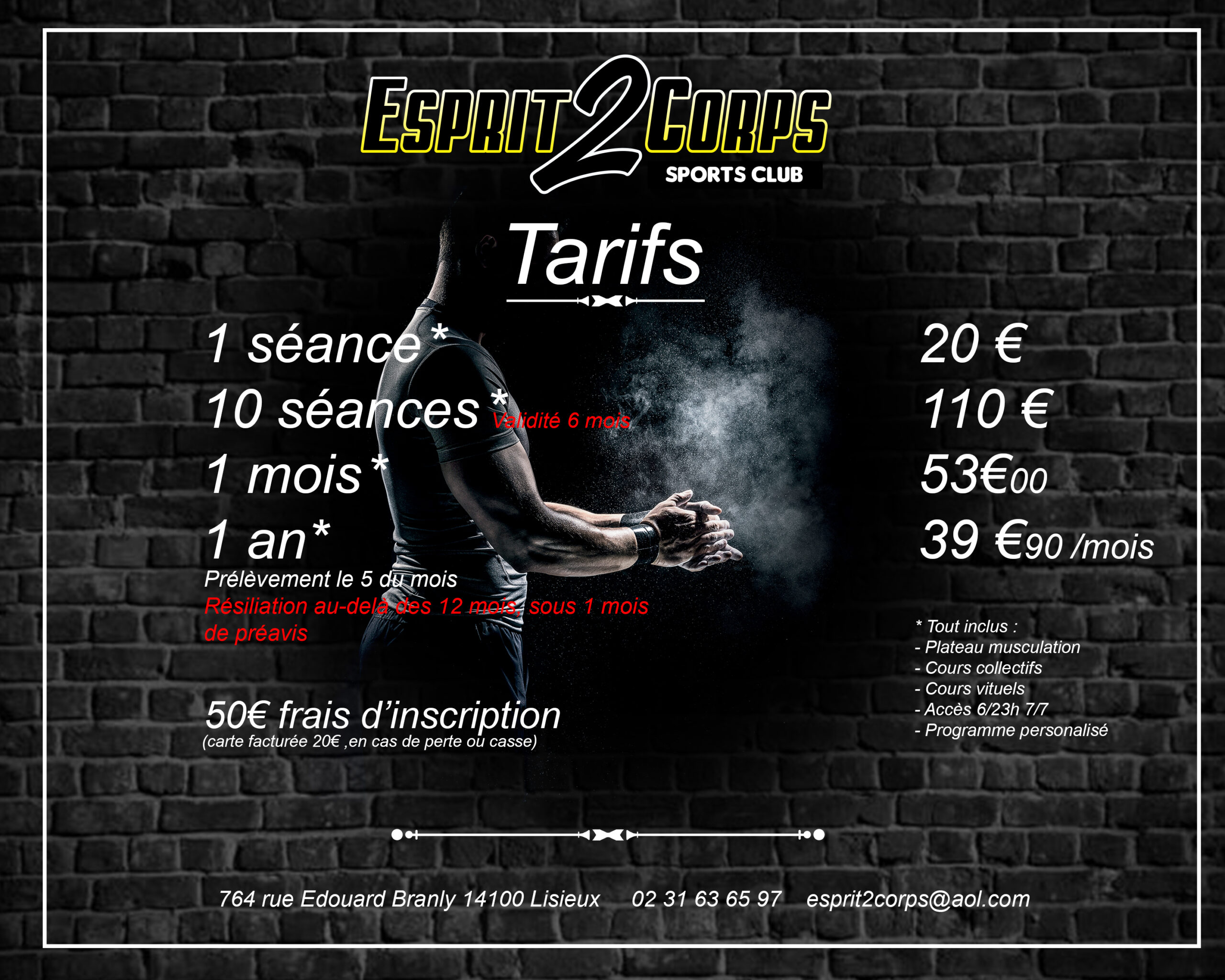 Ne perdez pas une minute de plus, rejoignez nous dès aujourd’hui et explorez les différentes formules d’adhésion pour trouver celle qui vous convient le mieux. Que vous cherchiez à vous muscler, à perdre du poids, à améliorer votre condition physique ou simplement à vous divertir tout en prenant soin de vous, nous sommes là pour vous accompagner dans chaque étape de votre parcours sportif. Bienvenue chez Esprit2corps à Lisieux, où le bien-être et l’épanouissement sont à portée de main !
